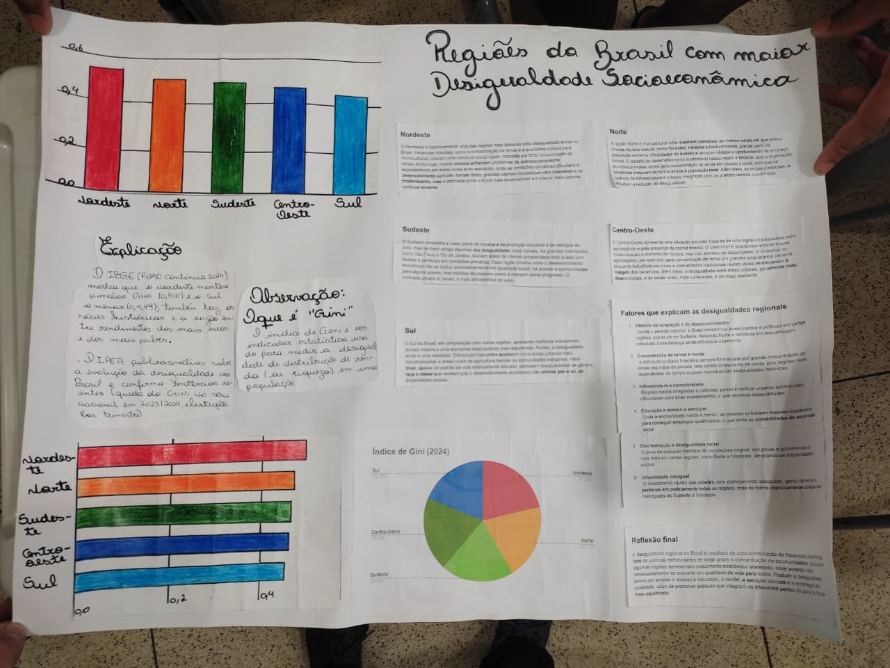 Durante a atividade, os alunos foram incentivados a analisar dados e estatísticas relacionados a questões sociais como distribuição de renda, acesso à educação, violência e desigualdade de gênero. A Matemática entrou como ferramenta essencial na leitura de gráficos e porcentagens, enquanto a Sociologia e a Filosofia ofereceram o embasamento teórico para discutir os significados éticos, sociais e políticos por trás dos números.