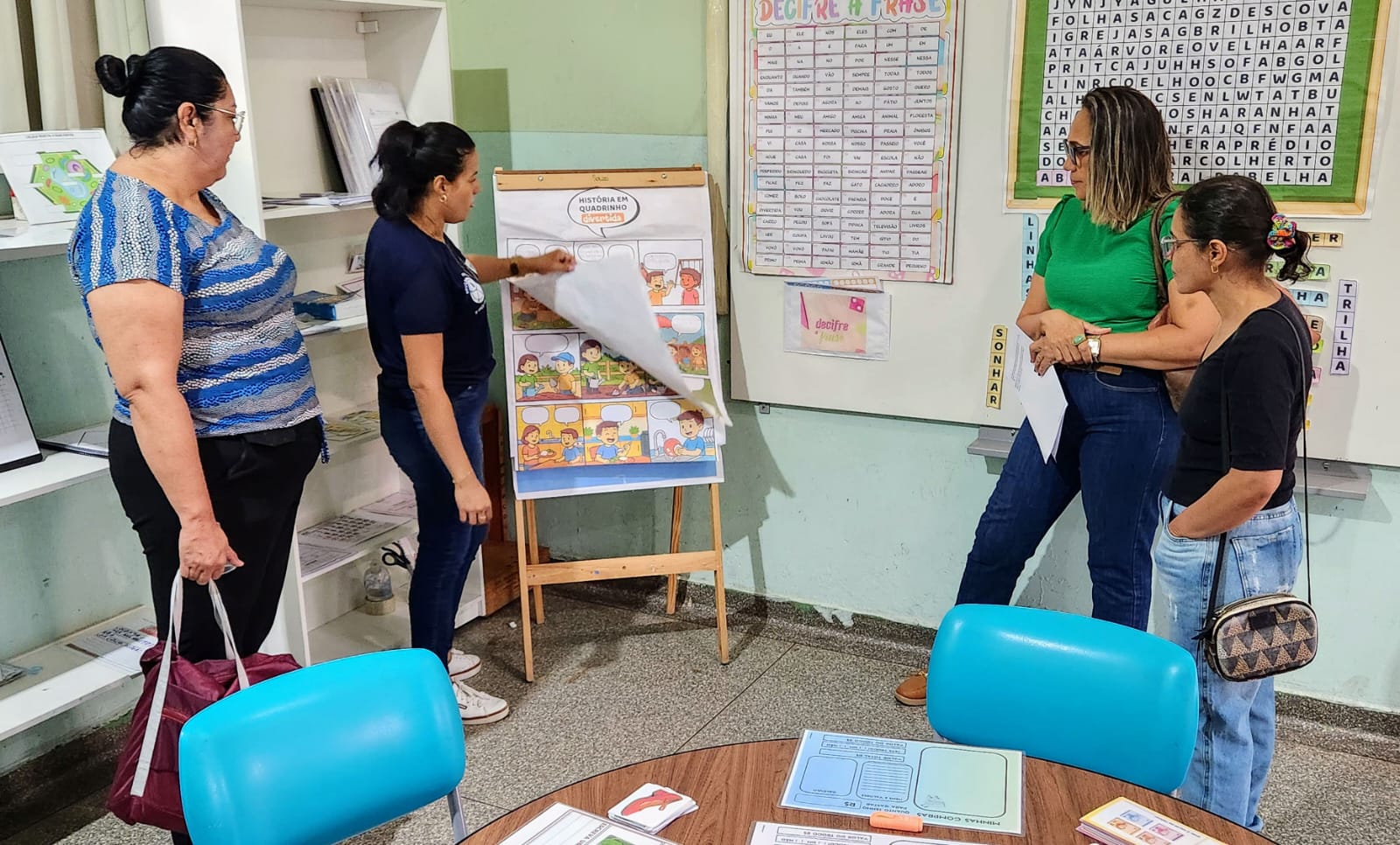 Durante os turnos da manhã e da tarde, os professores participaram de atividades em grupo, com base em textos reflexivos propostos para a formação. No período vespertino, o encontro foi ampliado com a visita dos docentes à sala de recursos multifuncional, momento que proporcionou a integração entre teoria e prática ao discutir estratégias pedagógicas voltadas à avaliação.