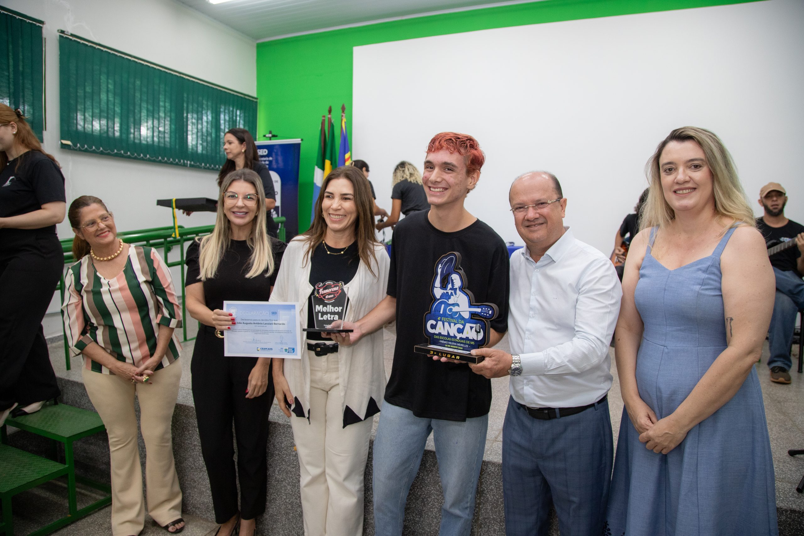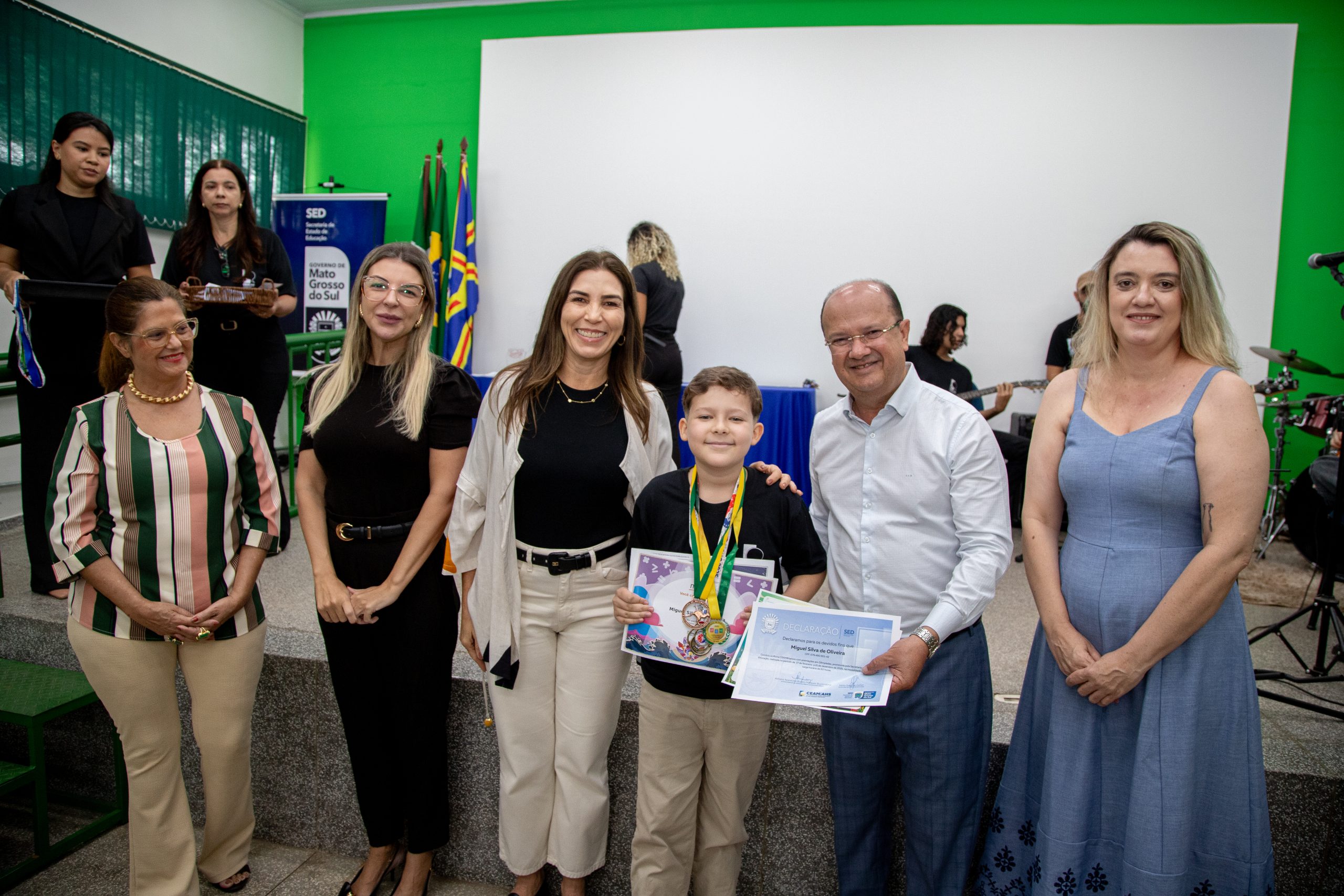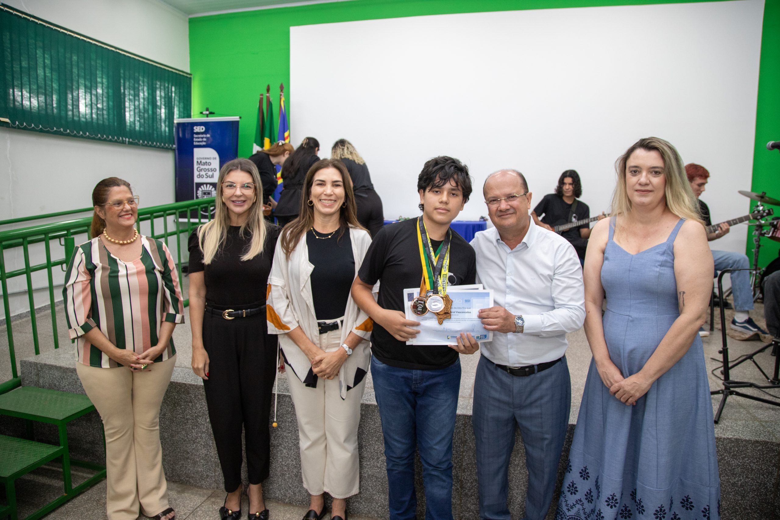 As medalhas foram entregues pelo vice-governador de MS, José Carlos Barbosa, o Barbosinha; pela primeira-dama do Estado, Mônica Riedel; e pela chefe de gabinete da SED, Chrystine Rocha.