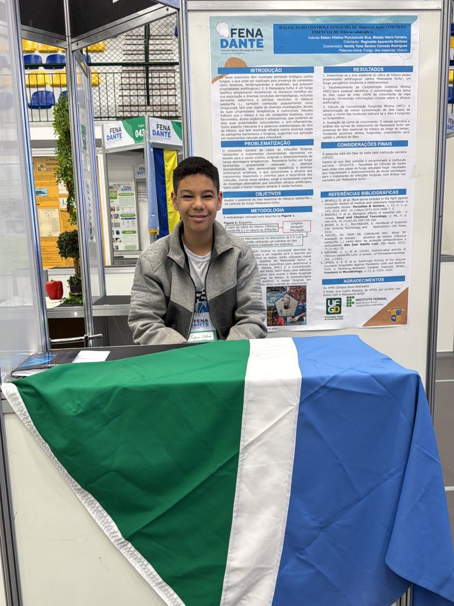 Os jovens pesquisadores Edson Vitalino Porciúncula Silva e Maislla Ferreira Vieira apresentaram o projeto “Avaliação do controle fungicida de Malassezia furfur com óleo essencial de Hibiscus sabdariffa L.”, desenvolvido sob orientação do professor Reginaldo Aparecido Barbosa e coorientação da professora Hemlly Yona Conrado Rodrigues.