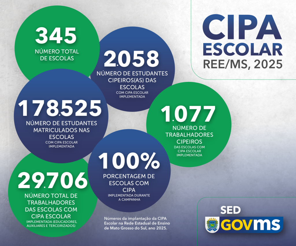 A SED/MS (Secretaria de Estado de Educação de Mato Grosso do Sul), por meio da CGC (Coordenadoria Geral de Gerenciamento de Crises, Riscos e Acidentes), conquistou o 1º lugar nacional na Campanha Nacional de Incentivo à Implementação das Comissões Internas de Prevenção de Acidentes, Doenças e Violências nas Escolas, em número de implantação de CIPAs Escolares em estabelecimentos de ensino, consagrando-se o único estado da federação a atingir uma cobertura de 100% nas unidades da REE.