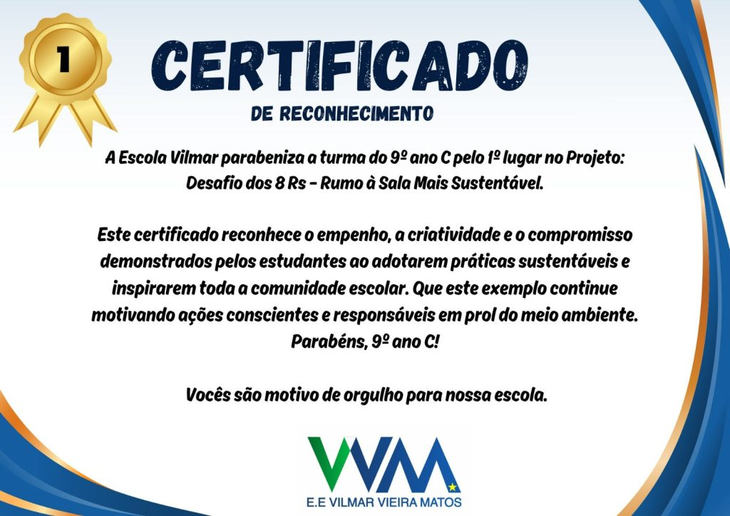 A competição foi encerrada com a vitória da turma 9º C, que obteve a maior pontuação e recebeu o título de “Sala Mais Sustentável da Escola”, além de um certificado e um lanche especial como forma de celebração. A turma ainda se destacou pela produção de jogos e brinquedos recicláveis, doados à Sala de Recursos Multifuncional da escola — gesto que ampliou o impacto social do projeto e reforçou o compromisso com a solidariedade e a sustentabilidade. A conquista foi divulgada no mural escolar e nas redes sociais institucionais.