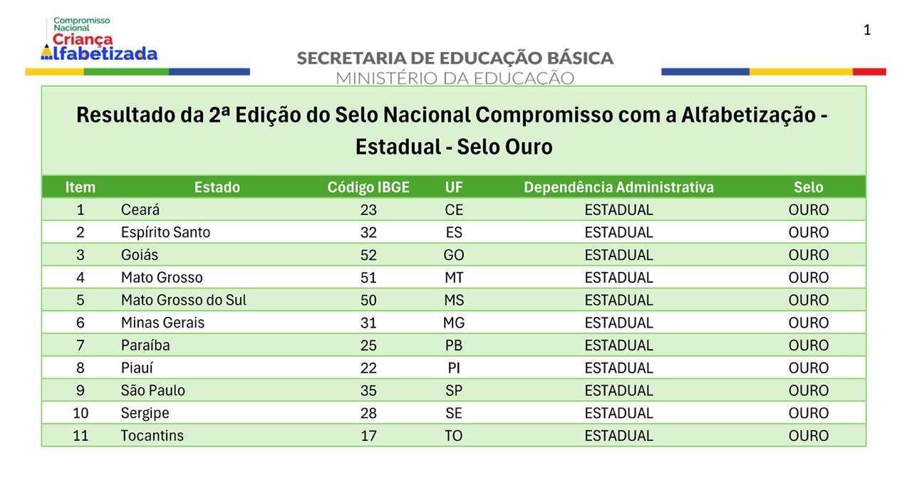 Pelo segundo ano consecutivo, a SED (Secretaria de Estado de Educação) conquista a categoria Ouro do Selo Nacional Compromisso com a Alfabetização 2025, concedido pelo MEC (Ministério da Educação).