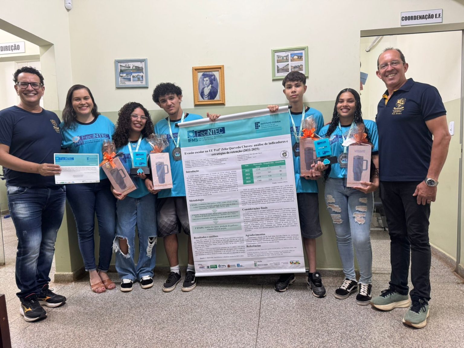 De 01 a 04 de outubro, os alunos do 1º ano E do ensino médio brilharam na FECINTEC – Feira Científica do Instituto Federal do Mato Grosso do Sul, apresentando o projeto “Evasão Escolar na E. E. Profª Zélia Quevedo Chaves: análise de indicadores e estratégias de retenção (2022–2025)”.