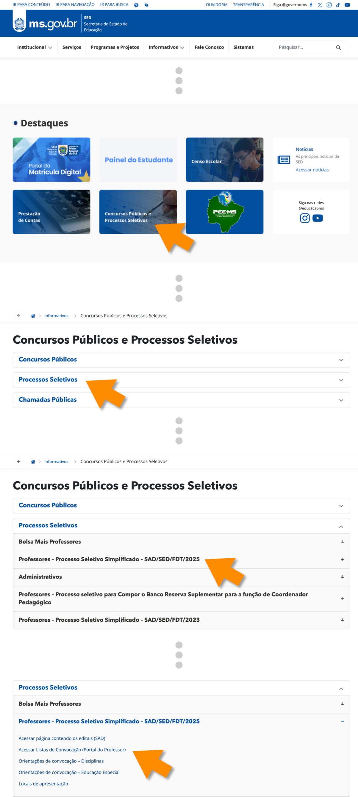 O candidato poderá consultar a lista de convocação e pesquisar por município, CPF ou nome e confirmar o dia, horário e local de apresentação, entrando no Portal SED https://www.sed.ms.gov.br/ e seguindo os seguintes passos: – Portal SED/Informativos/Concursos Públicos e Processos Seletivos/Processo Seletivo/ Professores – Processo Seletivo Simplificado – SAD/SED/FDT/2025.