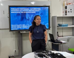 A gerente pedagógica do CAS/MS, Daniela Silva da Costa, abriu o evento destacando a importância da formação contínua e da parceria entre escolas, Coesp (Coordenadoria de Educação Especial) e CAS: “A participação ativa dos professores fortalece nossas ações e contribui diretamente para a qualidade da educação inclusiva dos estudantes surdos”.