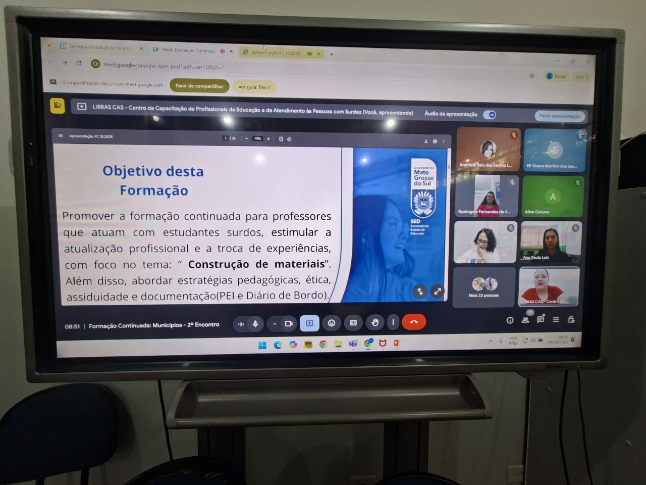 Nos dias 8 e 9 de outubro de 2025, a SED (Secretaria de Estado de Educação) realizou o segundo encontro da Formação Continuada voltada aos professores que atuam no apoio pedagógico especializado para estudantes surdos na REE/MS (Rede Estadual de Ensino de Mato Grosso do Sul).
